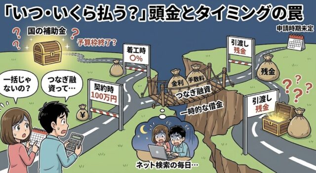 • 頭金はいつまでに、どう払う?: 「契約時に100万円、着工時に〇%……」。一括で払うものだと思っていた私たちは、何度も分割して支払うタイミングがあることに戸惑いました。